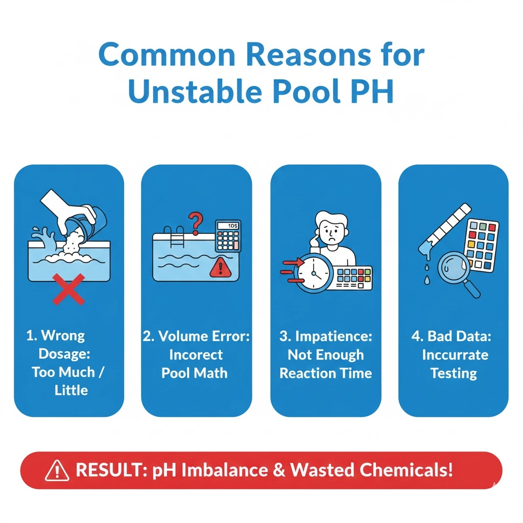 - When the water circulation in the swimming pool is insufficient, carbon dioxide in the air will gradually dissolve into the water, forming weak acids and lowering pH.
