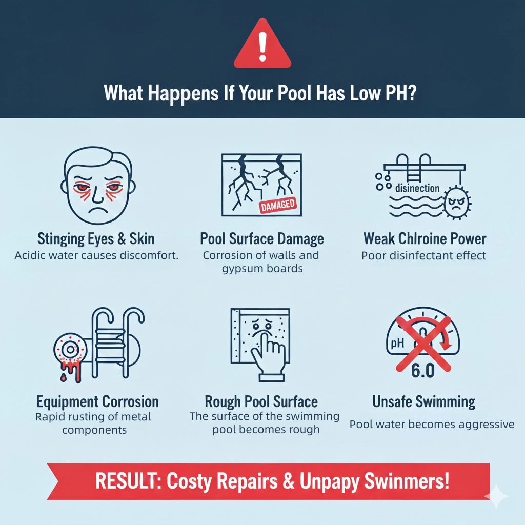 How to raise pH in pool? If you’ve noticed swimmers complaining about stinging eyes or your pool heater corroding too quickly, these are classic signs of low pH (acidic water).