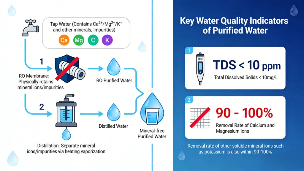 Purified water is not a natural water source, but an artificial state of water quality. Its core indicator is extremely low Total Dissolved Solids (TDS) content. According to strict pharmacopoeias or industry standards, the TDS value of purified water is usually required to be<10 ppm (parts per million), which means that almost only pure water molecules (H ₂ O) remain in the water.