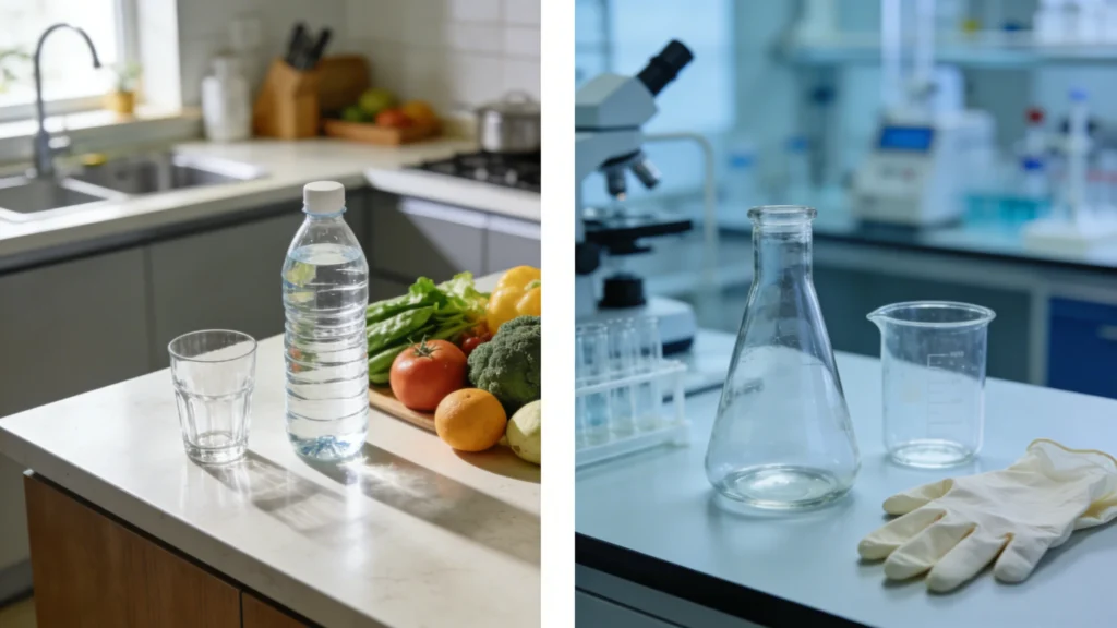 The pH number shows one of the most important scientific differences. In theory, distilled water should be neutral, but since it is so pure, it quickly takes in carbon dioxide from the air and turns it into carbonic acid. You have confirmed in your experimental blog that this often makes the pH value of distilled water weakly acidic (about 5.8), whereas the pH value of purified water is closer to neutral.