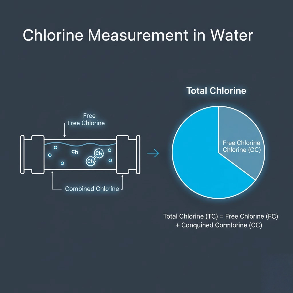- Chemical chlorine residued: including monochloroammonium (NH2Cl), dichloroammonium (NHCl2), trichloroammonium (NCl3), and other chloroamine compounds.