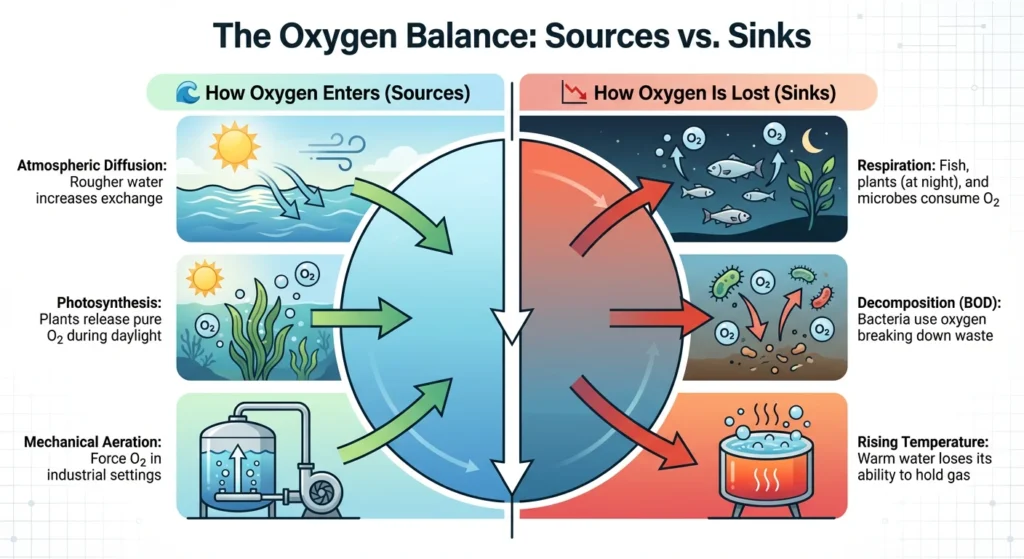 - Biological Demand: Photosynthesis by plants adds oxygen during the day, while respiration and decay consume it at night.